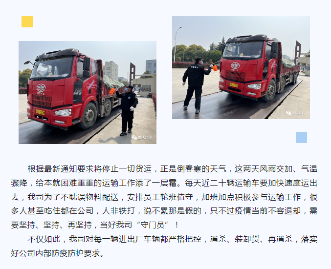● 自从接到通知,货车进出必须申报、申领通行证,我司立刻作出反应并严格按照要求落实闭环管理,从入宜卡口到公司期间司机不下车,到公司之后“即停即卸即装即走”,装卸货期间司机不下车。