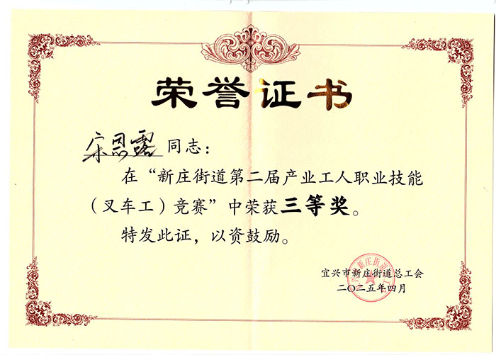 五一劳动节前夕,喜讯传来!在刚刚落幕的新庄街道第二届产业工人职业技能(叉车工)竞赛中,我公司机修车间员工宋恩露凭借扎实的技术功底和稳定的现场发挥,从众多优秀选手中脱颖而出,荣获三等奖!这一荣誉不仅是对他个人能力的肯定,更展现了我们一线产业工人精益求精、追求卓越的工匠精神!